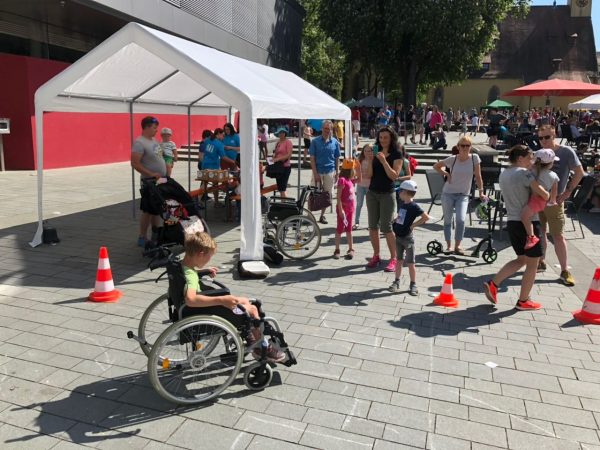 Beim Aktionstag „Familie spielt“ wurde am 06. Mai die Nürtinger Innenstadt zwischen Kreuzkirche und Stadthalle zu einem großen Spielplatz. Bei schönstem Sonnenschein konnten viele Kinder mit ihren Familien das große Spielangebot der verschiedenen Kooperationspartner des Bündnisses für Familie genießen. Die Offenen Hilfen beteiligten sich mit einem Rollstuhlparcours und Basteltisch .Für viele war es eine sehr eindrückliche Erfahrung, einmal selbst im Rollstuhl zu sitzen und zu erleben, wie viel Kraft und Geschick man dafür braucht.