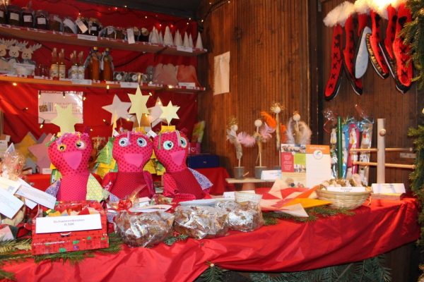 Auch dieses Jahr teilte sich die BFL einen Stand mit dem Jugendhaus „BOING“. Dank der tatkräftigen Unterstützung der Beschäftigten und Angehörigen und vielen weiteren Unterstützern der BFL, konnten wir ein breites Band an verschiedenen Geschenkartikeln und Köstlichkeiten anbieten. Von gestrickten Socken, über Holznikoläuse bis hin zu vielen verschiedenen Marmeladen und Weihnachtsplätzchen war alles dabei.