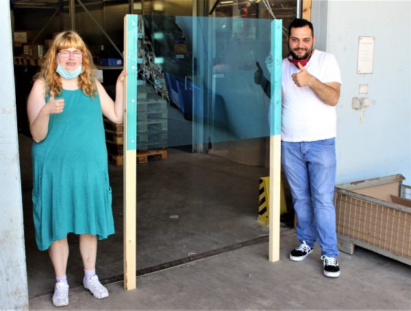 Auch zahlreiche Plexiglas-Trennwände konnten zum Schutz der Mitarbeitenden und Beschäftigten angeschafft werden. Das Bild zeigt Sabrina Jacobs (Beschäftigte, Werkstatt Oberboihingen) und Hakan Adigüzel (Beschäftigter, Werkstatt Oberboihingen).