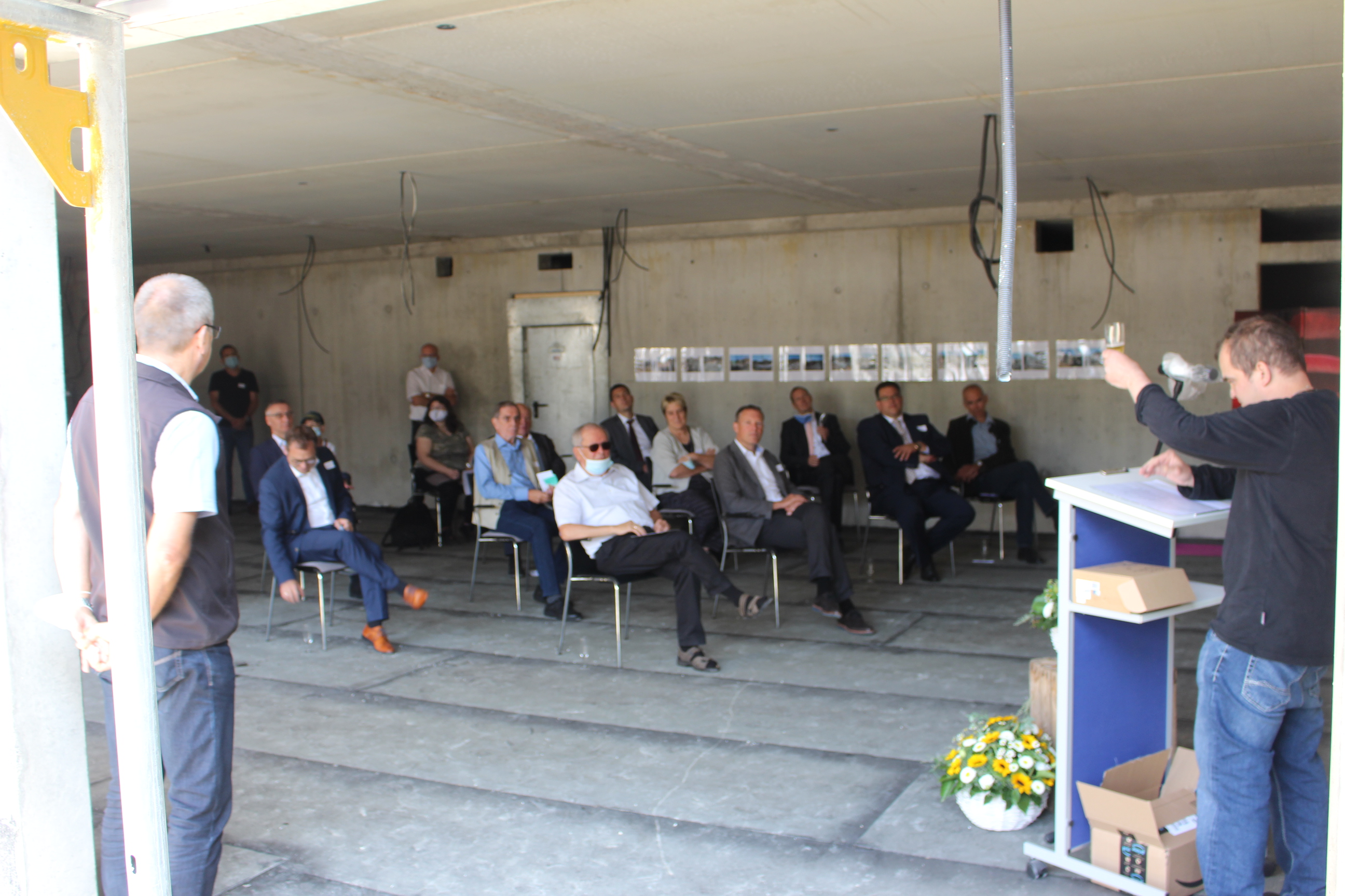 Vorstandsvorsitzender Günter Schempp begrüßte die Gäste des Fests – darunter die Architekten, die Baufirmen, Vertreter der Banken und der Gemeinde sowie die Nachbarn. Andreas Layh führte traditionell den Richtspruch vom Dach aus durch und wünschte dem Bauprojekt eine weiterhin erfolgreiche Durchführung. Michael Köber vom Landratsamt und Bürgermeister Simon Blessing begrüßten den Neubau in ihren Grußworten und wünschten einen weiterhin unfallfreien Verlauf der Bauarbeiten.