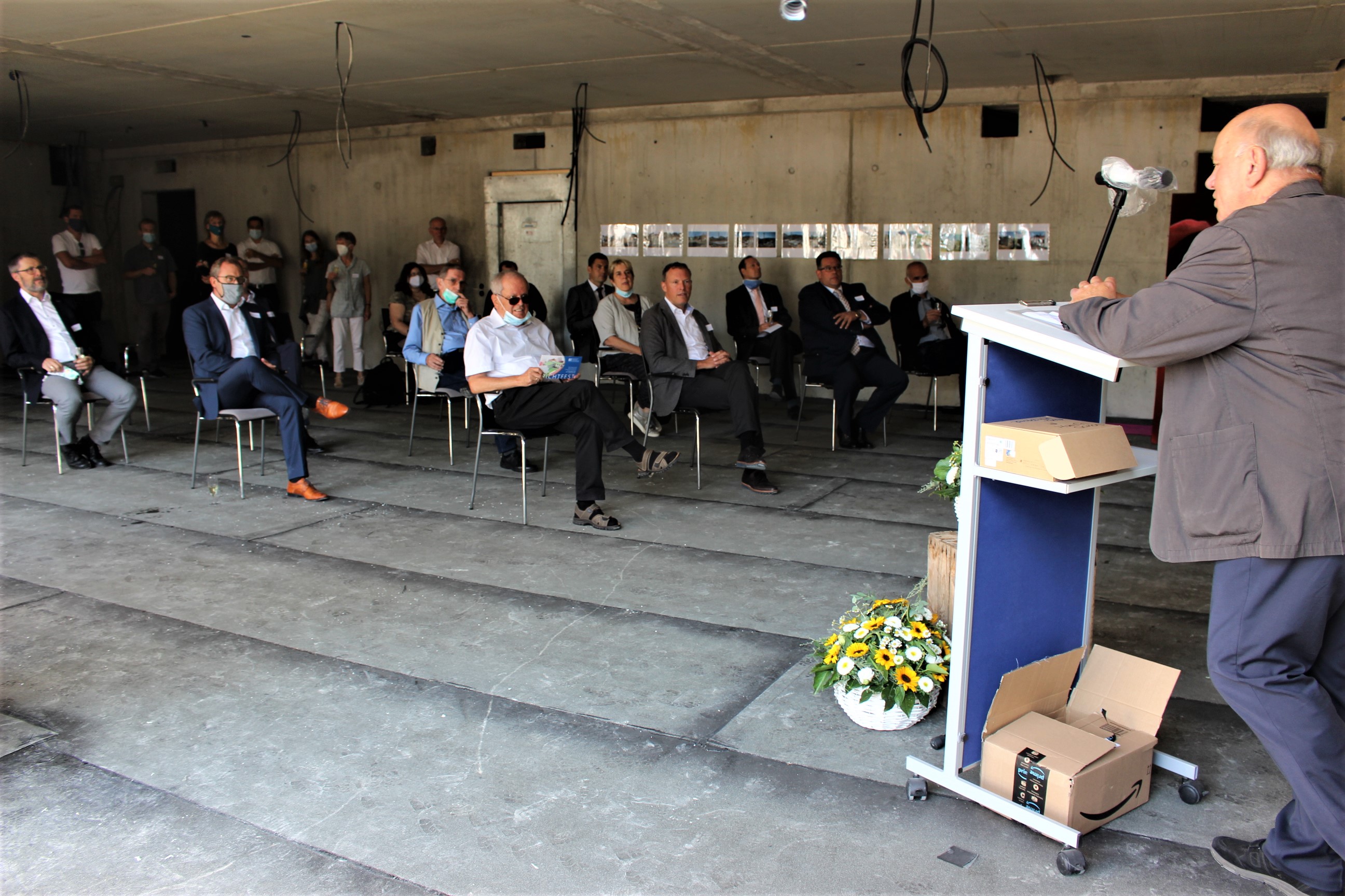 Vorstandsvorsitzender Günter Schempp begrüßte die Gäste des Fests – darunter die Architekten, die Baufirmen, Vertreter der Banken und der Gemeinde sowie die Nachbarn. Andreas Layh führte traditionell den Richtspruch vom Dach aus durch und wünschte dem Bauprojekt eine weiterhin erfolgreiche Durchführung. Michael Köber vom Landratsamt und Bürgermeister Simon Blessing begrüßten den Neubau in ihren Grußworten und wünschten einen weiterhin unfallfreien Verlauf der Bauarbeiten.