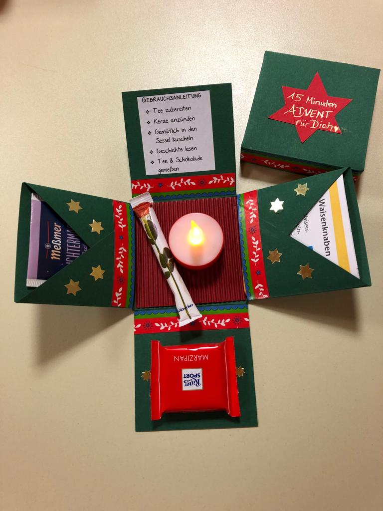 Zum Schluss bekam jeder seine Box mit der Aufschrift „15 Minuten Advent für dich“ – was wohl darin war? Auch eine große Orange gab es noch dazu – mit dem Hinweis, dass sie zu dem Inhalt der Box gehöre. Wann wohl die erste Box geöffnet wurde?