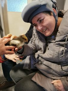 Ein Ausflug zu Monika Handel bescherte den Teilnehmenden aus dem Förder- und Betreuungsbereich Linsenhofen eine gefiederte Überraschung. Neben Ziegen und Hasen gab es auch Hühner und sogar kleine Küken.