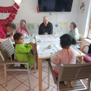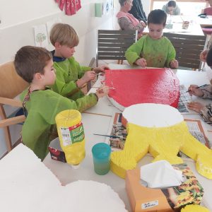 Immer mal wieder an einem Donnerstag treffen sich die Förder- und Betreuungsgruppe aus Linsenhofen mit dem benachbarten Kindergarten zu einem besonderen Projekt. Seit Oktober verfolgen sie ein großes Ziel: den 1. Linsenhöfer Weihnachtspfad. Bereits kurz nach 10 Uhr hört man Kinderstimmen aus der Ferne, die sich wenig später fröhlich am Tisch versammeln, um gemeinsam zu werkeln. Es werden Sterne aus Ton ausgestochen, und Styroporfiguren, die oft größer sind als die Kinder, erhalten fleißig Farbe. Vom Weihnachtsmann über das Christkind bis zum Rentier und dem bunten Hasen ist alles vertreten.