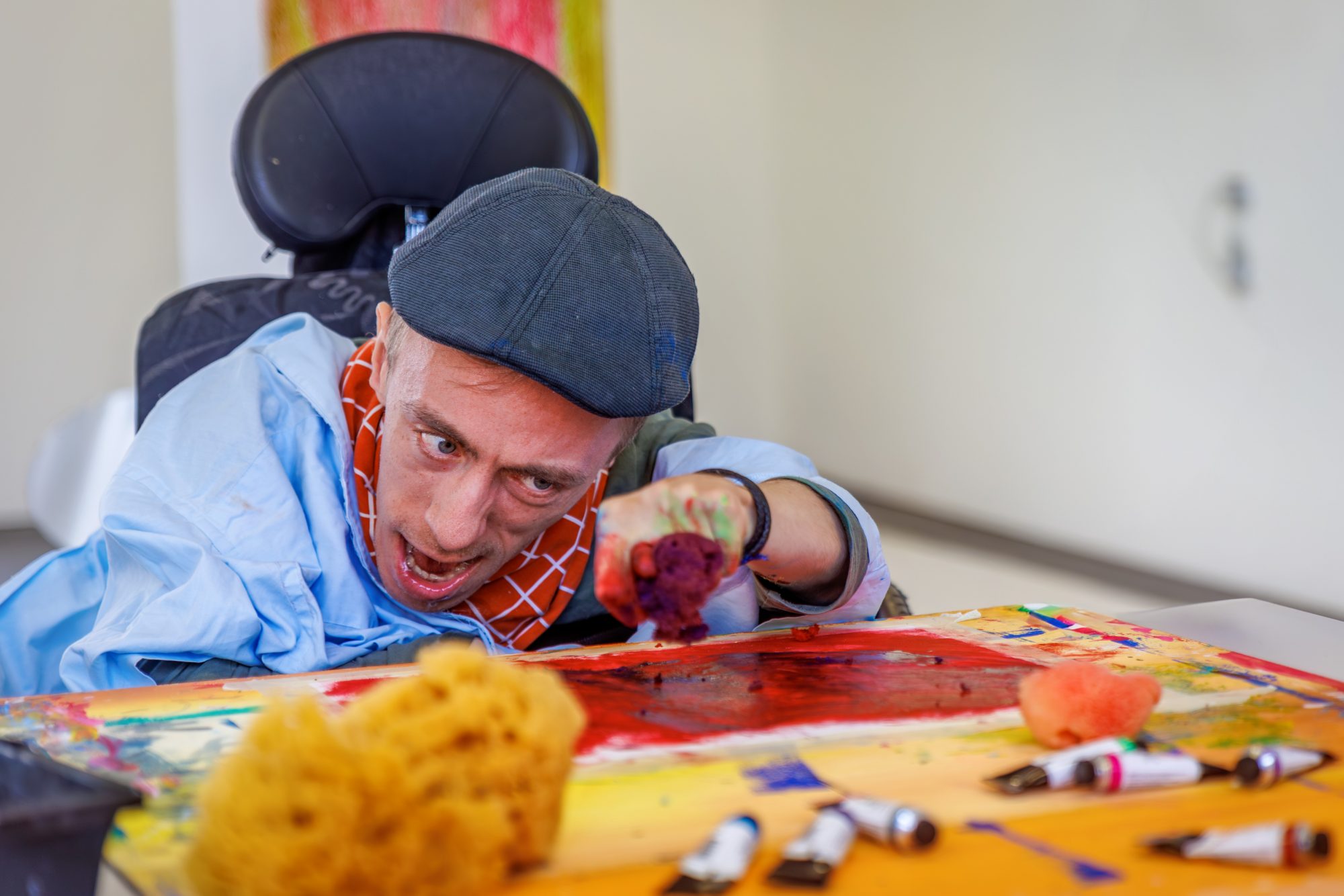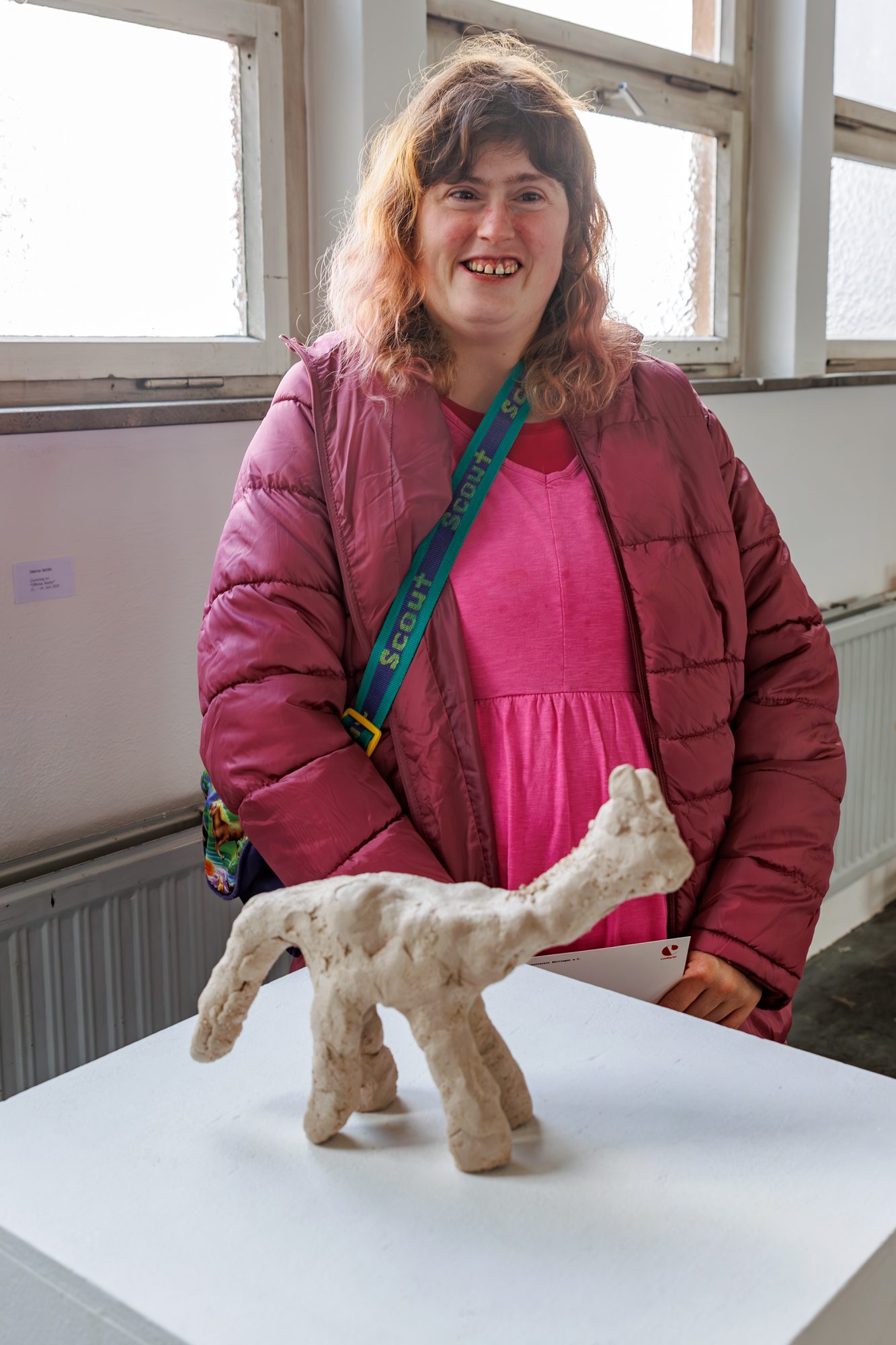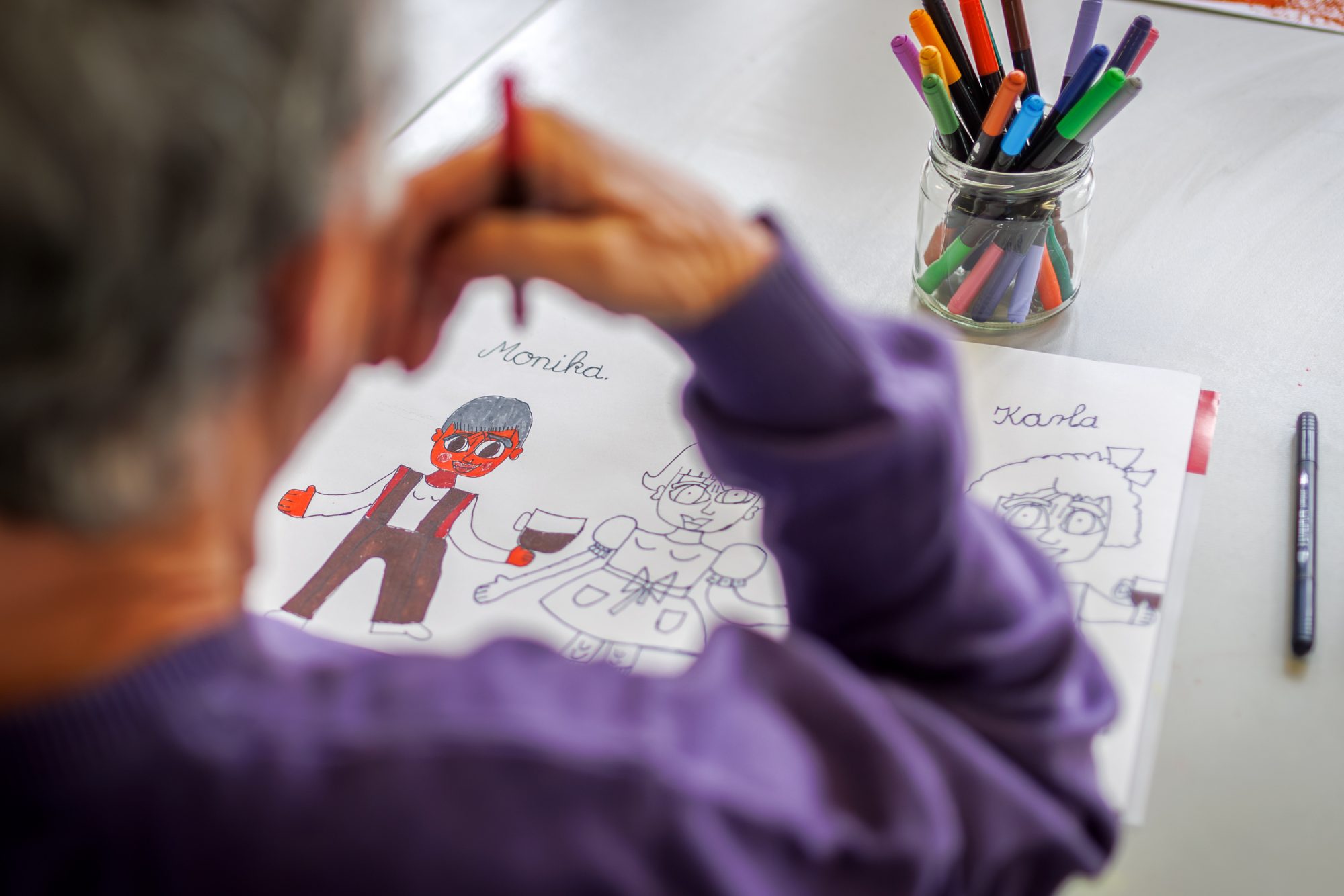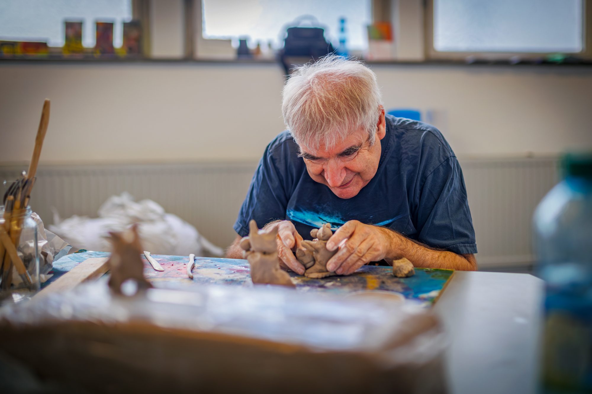 So vielseitig die Künstlerinnen und Künstler, so vielseitig waren auch ihre Werke. So widmete sich Rolf aus dem Wohnheim in Oberboihingen detailverliebt der Schaffung von Figuren aus Ton – und schuf dazu gleich eine eigene Geschichte. Hoch konzentriert auch Monika aus dem Förder- und Betreuungsgruppe in Linsenhofen, die ihre Zeichnungen mit ruhiger Hand mit einem Bleistift umsetzt. Und auch Julia aus dem ABW in Nürtingen zeigt sich begeistert und künstlerisch zugleich mit ihren farbenfrohen Bildern die sie mit einem Schwamm gestaltete.