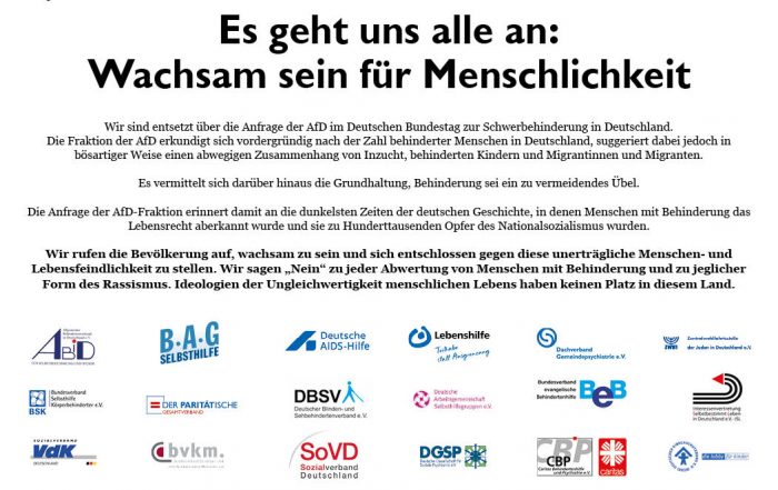 Anzeige in der FAZ vom 22.4.2018 Wir sind entsetzt über die Anfrage der AfD im Deutschen Bundestag zur Schwerbehinderung in Deutschland. Die Fraktion der AfD erkundigt sich vordergründig nach der Zahl behinderter Menschen in [...]